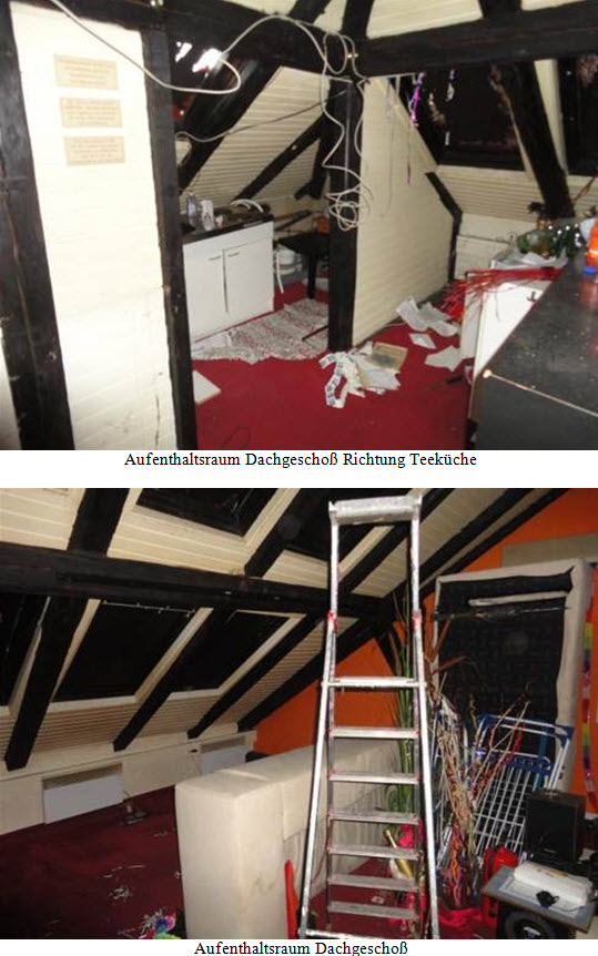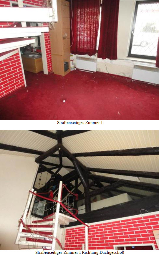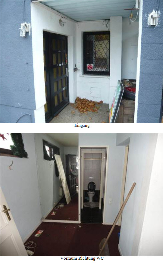 | Beschreibung des mitzuversteigernden Zubehörs: | An Zubehör/Fahrnissen sind u.A. vorhanden: Schränke/Kästen, Regale, Bar, Kühlschrank, Waschmaschine, montierte Spiegel, E-Heizstrahler, Vorhänge, div. Gerümpel, etc. Das Zubehör/die Fahrnisse befinden sich insgesamt in einem stark abgenützten, veralteten und stark verschmutzten Zustand. Hinsichtlich der technischen Geräte konnte die Funktionstüchtig-keit nicht geprüft werden bzw. ist diese fraglich. |