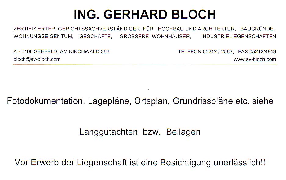 | Sonstige Hinweise: | Auf das auch beim Bezirksgericht Innsbruck, Bruneckerstraße 3, Zimmer 323 im 3. Stock zur Einsichtnahme von 8.00 bis 12.00 Uhr aufliegende Gutachten wird hingewiesen. |
