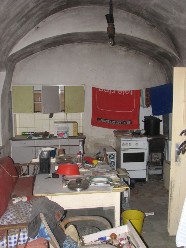 | Beschreibung (WE): | Die Liegenschaft EZ 27 Grundbuch 19475 Hausenbach besteht aus einem kleinen landwirtschaftlichen Anwesen mit einem Wohnhaus und Nebengebäuden (Grundstücke Nr. 374 und 188), einer kleinen Waldfläche (Grundstücke Nr. 206/2, 207 und 386) sowie einem gemäß Flächenwidmung als Gewässer ausgewiesenem Grundstück (Grundstück Nr. 186/1) allesamt am östlichen Rand des Ortsgebietes von Hausenbach gelegen. Auf den Grundstücken Nr. 374 und 188 (ehemalige Hofstelle) bestehen - L-förmig angeordnet - das Wohngebäude und die ehemaligen Wirtschafts- bzw. Nebengebäude mit einem Stallgebäude und einer ehemaligen Mühle, einem weiteren kleinen Nebengebäude - zwischen der Eingangstüre und dem Einfahrtstor in den Innenhof gelegen - mit Heizungs- und einem Öltankraum sowie einer kleinen Scheune. Der Innenhof ist vierseitig durch die vorhandenen Gebäude bzw. durch Hofmauern umschlossen. Der Eingang in den Innenhof sowie die Einfahrt durch das Hoftor sind an der Südostseite der Hofstelle über das angrenzende Wiesengrundstück gegeben. Die Zufahrt zur Liegenschaft erfolgt von der durch den Ort führenden Landesstraße in die in westlicher Richtung (Richtung Dietersberg) geführten Landesstraße. Im Bauakt der Marktgemeinde Karlstetten liegen mit Ausnahme eines Planes für einen Umbau im Bereich des Stallgebäudes keine Unterlagen über die Errichtung des Gebäudebestandes auf. Die Errichtung der Gebäude erfolgte überwiegend in der ersten Hälfte des 20. Jahrhunderts. An der nordostseitigen Grundgrenze neben der angrenzenden Landesstraße ist außerhalb der Hofmauer eine Jauchengrube vorhanden. Westseitig durch die Landesstraße abgetrennt sind die Grundstücke Nr. 206/2, Nr. 207 und Nr. 386 sowie das Grundstück Nr. 186/1 vorhanden. Die vorgenannten Grundstücke bilden eine zusammenhängende Einheit und sind im Bereich entlang der angrenzenden Landesstraße und im Bereich des widmungsmäßig ausgewiesenen Gewässergrundstückes (Nr. 186/1) als bewaldeter Geländeeinschnitt ("Graben") ausgebildet. Der Bereich des Grundstücks Nr. 207 ist als annähernd ebene Waldfläche mit leichter Geländeneigung in östlicher Richtung (Gefälle zum Geländeeinschnitt) ausgebildet. Die Waldflächen sind überwiegend mit Buchen sowie einzelnen Linden und Fichten bewachsen. Das Grundstück Nr. 186/1 (Flächenwidmung - Gewässer) ist als bewaldeter Geländeeinschnitt ausgebildet. Ein Gewässer ist derzeit nicht vorhanden. Das ehemalige Gewässer wurde zum Betrieb der alten Mühle im Nebengebäude der bewertungsgegenständlichen Liegenschaft verwendet. Das Wohngebäude befindet sich in einem dem Alter entsprechend stark abgenutzten Zustand. An der Außenfassade sind Schäden an der Verputzoberfläche vorhanden, im Gebäudeinneren sind teilweise Feuchteschäden und Schäden an den Wand- und Deckenoberflächen (Verputzschäden) sowie beschädigte Türen und Fenster vorhanden. Die Nebengebäude sind überwiegend ist desolatem Zustand vorhanden, Holzzwischendecken und die Dachkonstruktionen sind an mehreren Stellen schadhaft. Die Liegenschaft ist seit einigen Jahren unbewohnt, die bestehenden Gebäude und die Freiflächen des Innenhofes sind in einem ungepflegten Zustand vorhanden, ein Großteil der Räumlichkeiten sowie Teile des Innenhofes sind mit Sperrmüll und Gerümpel angeräumt. |
